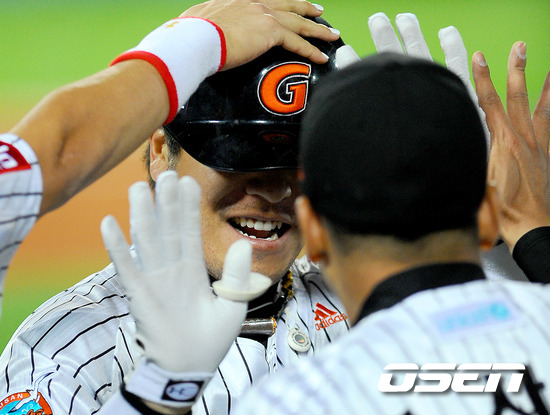 17일 오후 부산 사직구장서 열린 2011 롯데카드 프로야구 플레이오프 2차전 롯데 자이언츠와 SK 와이번스의 경기 8회말 2사 롯데 강민호가 쐐기 솔로홈런을 날리고 팬들에게 동료들의 축하를 받고 있다. 플레이오프 2차전서 롯데는 양승호 감독이 예고한대로 송승준을 SK 이만수 감독은 고든을 각각 선발로 내세웠다. 송승준은 유독 SK에 시즌 내내 약세를 보여왔지만 양승호 감독은 선발로 밀어부치는 뚝심을 보여 결과가 어떻게 나올지 주목된다. 한편 1차전은 SK가 연장 10회 접전 끝에 롯데에 7-6의 기분좋은 역전승을 거두며 기선제압에 성공했다. 과연 2차전에서 송승준이 감독의 믿음에 부응, 위기의 팀을 구해 지긋지긋한 가을 악몽을 떨쳐낼지 아니면 SK 고든이 준플레이오프 상승세를 이어가며 2연승을 이끌지 관심이 집중된다 / soul1014@osen.co.kr