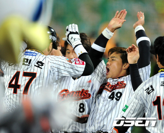 2011 롯데카드 프로야구 플레이오프 2차전 8회말 2사 강민호가 좌중간 담장을 넘기는 솔로 홈런을 치고 들어오자 홍성흔이 환호하고 있다. 17일 부산 사직구장에서 벌어진 플레이오프 2차전서 롯데는 양승호 감독이 예고한대로 송승준을 SK 이만수 감독은 고든을 각각 선발로 내세웠다. 송승준은 유독 SK에 시즌 내내 약세를 보여왔지만 양승호 감독은 선발로 밀어부치는 뚝심을 보여 결과가 어떻게 나올지 주목된다. 한편 1차전은 SK가 연장 10회 접전 끝에 롯데에 7-6의 기분좋은 역전승을 거두며 기선제압에 성공했다. 과연 2차전에서 송승준이 감독의 믿음에 부응, 위기의 팀을 구해 지긋지긋한 가을 악몽을 떨쳐낼지 아니면 SK 고든이 준플레이오프 상승세를 이어가며 2연승을 이끌지 관심이 집중된다. /spjj@osen.co.kr