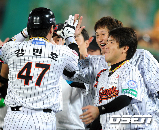 2011 롯데카드 프로야구 플레이오프 2차전 8회말 2사 강민호가 좌중간 담장을 넘기는 솔로 홈런을 치고 환호하고 있다. 17일 부산 사직구장에서 벌어진 플레이오프 2차전서 롯데는 양승호 감독이 예고한대로 송승준을 SK 이만수 감독은 고든을 각각 선발로 내세웠다. 송승준은 유독 SK에 시즌 내내 약세를 보여왔지만 양승호 감독은 선발로 밀어부치는 뚝심을 보여 결과가 어떻게 나올지 주목된다. 한편 1차전은 SK가 연장 10회 접전 끝에 롯데에 7-6의 기분좋은 역전승을 거두며 기선제압에 성공했다. 과연 2차전에서 송승준이 감독의 믿음에 부응, 위기의 팀을 구해 지긋지긋한 가을 악몽을 떨쳐낼지 아니면 SK 고든이 준플레이오프 상승세를 이어가며 2연승을 이끌지 관심이 집중된다. /spjj@osen.co.kr