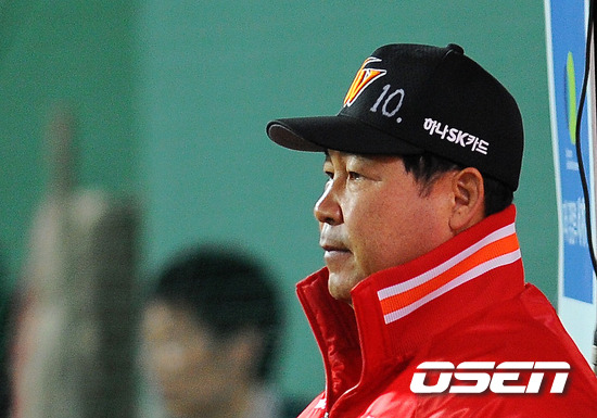 2011 롯데카드 프로야구 플레이오프 2차전 9회초 이만수 감독대행이 경기를 바라보고 있다. 17일 부산 사직구장에서 벌어진 플레이오프 2차전서 롯데는 양승호 감독이 예고한대로 송승준을 SK 이만수 감독은 고든을 각각 선발로 내세웠다. 송승준은 유독 SK에 시즌 내내 약세를 보여왔지만 양승호 감독은 선발로 밀어부치는 뚝심을 보여 결과가 어떻게 나올지 주목된다. 한편 1차전은 SK가 연장 10회 접전 끝에 롯데에 7-6의 기분좋은 역전승을 거두며 기선제압에 성공했다. 과연 2차전에서 송승준이 감독의 믿음에 부응, 위기의 팀을 구해 지긋지긋한 가을 악몽을 떨쳐낼지 아니면 SK 고든이 준플레이오프 상승세를 이어가며 2연승을 이끌지 관심이 집중된다. / sunday@osen.co.kr