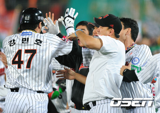 롯데가 지긋지긋한 포스트 시즌 연패의 늪에서 벗어나며 부산 팬들에게 기쁨을 선사했다. 8회말 쐐기홈런을 친 강민호를 송승준이 반갑게 맞이하고 있다. 17일 오후 부산 사직구장에서 벌어진 2011 롯데카드 프로야구 플레이오프 2차전서 롯데는 송승준의 1실점 역투와 전준우의 투런 홈런,강민호의 쐐기 솔로 홈런으로 SK에 4-1로 승리를 거두었다. 덕분에 롯데는 지난 1999년부터 이어진 포스트시즌 홈 연패에서 벗어났다. 무려 4378일 만의 포스트 시즌 승리다. 한편 프로야구 플레이오프는 5전 3선승제로 진행되며 19일 오후6시에 인천 문학경기장에서 3차전 경기를 갖게 된다. /spjj@osen.co.kr