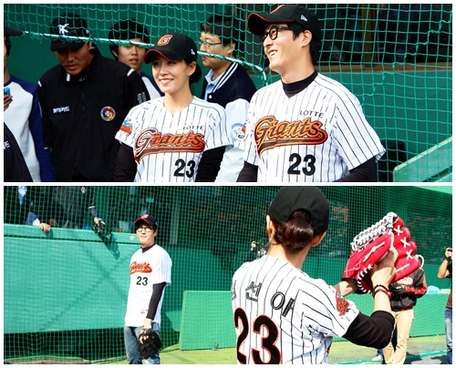 개봉 이후 뜨거운 입소문을 타며 인기 몰이 중인 ‘투혼’의 김주혁, 김선아가 부산 사직구장에서 열린 야구 경기에 시구시타자로 나서 눈길을 끌었다. 김주혁, 김선아는 영화 촬영에 전폭적인 지원을 보내준 롯데자이언츠와의 인연으로 지난 16일 오후 부산 사직구장서 열린 ‘2011 롯데카드 프로야구 플레이오프’ 1차전 시구시타자로 나섰다. 김주혁, 김선아가 경지장에 들어서자마자 사직구장을 가득 메운 관중들은 열렬한 환호를 보냈고, 극 중 주인공(윤도훈)과 같이 등번호 23번을 나란히 달고 경기장에 입장한 이들은 경기 전 운동장 한쪽에서 가볍게 몸을 풀며 다정한 모습을 과시했다. 특히 극 중 롯데자이언츠의 간판투수로 열연한 김주혁은 직접 김선아에게 세심하게 투구폼을 지도하는 등 훈훈한 모습을 보여주기도 해 눈길을 끌었다. 한편 시구자로 나선 김선아는 완벽하고도 유연한 와인드업을 선보이며 관중들을 놀라게 했고, 시타자로 나선 김주혁마저 깜짝 놀라게 한 개념시구로 뜨거운 박수갈채를 받았다. 시구시타를 마친 김주혁과 김선아는 관중석에서 롯데자이언츠와 SK와이번스의 경기를 직접 관람했다. 두 사람은 선수들의 응원가를 따라 부르는 것은 물론, 사직구장의 명물인 신문지와 주황 비닐봉지까지 동원해 팬들과 한마음이 되어 롯데자이언츠를 열렬히 응원했다. 김주혁, 김선아의 완벽한 호흡을 자랑하는 휴먼 코미디 ‘투혼’ 지난 6일 개봉해 인기리에 상영중이다. tripleJ@osen.co.kr