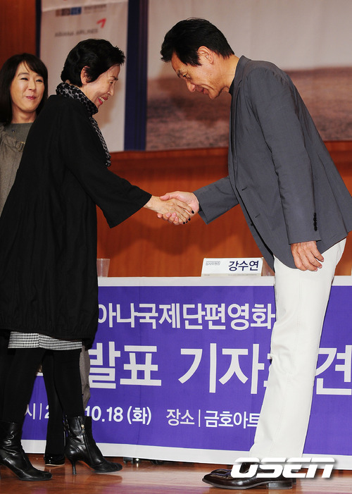 18일 오전 서울 신문로 금호아트홀에서 열린 ‘제9회 아시아나국제단편영화제 상영작 발표 기자회견에서 손숙 이사장과 집행위원장 안성기가 악수를 나누고 있다. 이번 ‘아시아나국제단편영화제’는 일본의 이누도 잇신 감독과 토노 세이고 숏쇼츠필름페스티벌&아시아 집행위원장, 사라 호쉬 델롱 과나후아토국제영화제 집행위원장, 김태용 감독, 배우 강수연 등이 심사를 맡아 진행된다. 경쟁 부문 심사 대상작은 35개국 60편으로 국제경쟁 부문의 경우 90개국에서 총 2173편이 응모했다. 이 가운데 한국 작품 10편, 외국 작품 44편이 본선에 올랐다. 지난해 신설된 국내부분경쟁인 ‘트래블링 쇼츠 인 코리아’(Traveling Shorts in Korea)에는 156편이 응모한 가운데 6편이 본선에 진출했다. 단편영화들의 즐거운 축제로 기대를 모으고 있는 ‘아시아나국제단편영화제’는 오는 11월 2일부터 7일까지 씨네큐브 광화문에서 개최된다. / rumi@osen.co.kr