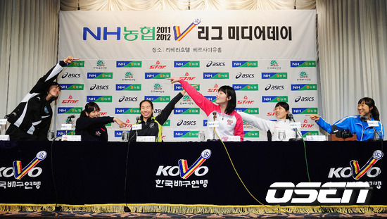 [OSEN= 백승철 인턴기자] 18일 오전 서울 청담동 리베라 호텔에서 열린 'NH농협 2011-2012 V리그' 여자부 미디어데이에 참석한 각팀 주장들이 올 시즌 우승 예상팀 질문에 현대건설을 가리키고 있다. 정규리그 순위 승점제 도입과 외국인선수 3세트 출전제한 폐지, 포스트시즌 경기 수 변경 등이 반영된 'NH농협 2011-2012 V리그' 여자부 경기는 오는 22일 첫 경기를 시작으로 6개월여간의 대장정에 들어간다. / baik@osen.co.kr