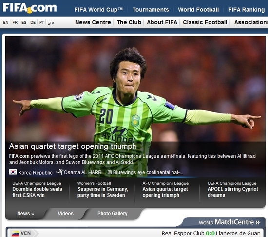국제축구연맹(FIFA)가 아시아축구연맹(AFC) 챔피언스리그 4강 1차전 예상 기사를 게재하며 '라이언킹' 이동국(전북)을 초기 화면에 올려놨다. FIFA는 지난 18일(이하 한국시간) ACL 4강 1차전에 대한 프리뷰를 작성했다. 전북과 알 이티하드(사우디아라비아) 그리고 수원과 알 사드(카타르)의 4강전에 대해 감독과 선수들의 인터뷰와 함께 자세하게 경기에 대한 정보를 제공했다. FIFA는 알 이티하드와 전북의 경기에 대해 K리그 팀에 강한 킬러와 K리그 정상을 질주하는 팀의 대결이라고 설명했다. 알 이티하드가 가장 최근 서울에 승리를 거둔 것을 비롯해 2004년 전북과 성남 일화, 이듬해 부산 아이파크를 꺾고 대회 2연패를 당성한 것에 대해 설명했다. 하지만 전북도 만만치 않은 전력을 가지고 있다고 전했다. 전북 최강희 감독은 "우리 선수들이 굉장히 강한 정신력을 가지고 있기 때문에 분명히 좋은 결과를 얻어낼 수 있을 것"이라면서 승리에 강한 자신감을 드러냈다. 알 이티하드의 사우디아라비아 국가대표 모하메드 누르는 "알 이티하드가 아시아에서 가장 강력한 팀"이라면서 "이날 경기서 승리를 위해 필요한 골은 단 1골"이라고 승리를 예고했다. 전북과 알 이티하드전은 오는 20일 사우디아라비아 제다에서 열리고 수원과 알 사드의 경기는 19일 수원월드컵경기장에서 열린다. 10bird@osen.co.kr FIFA 홈페이지 캡처.
