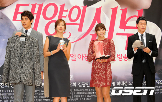 SBS 새 아침드라마 '태양의 신부' 제작발표회가 19일 오후 서울 SBS 목동 사옥에서 열렸다. 배우 정은우, 장신영, 연미주, 송유하가 포토타임을 갖고 있다. '태양의 신부'는 드라마 '마이더스' '자이언트'를 공동 연출한 이창민 PD와 '101번째 프러포즈'의 대본을 쓴 윤영미 작가가 의기투합한 작품이다. '태양의 신부'는 2011년판 심청 이야기로 가난 때문에 한 집안의 실질적 가장이 돼버린 여주인공이 가족을 위해 자신을 희생하고 나이 많은 회장의 후처로 들어가 사랑과 증오가 얽힌 운명에 휘말린다. 하지만 지혜와 기지로 자신과 가족을 지켜내고 가난 속에 키운 긍정의 힘으로 운명을 극복하는 이야기를 그린다. 한편, '태양의 신부'는 24일 '미쓰 아줌마' 후속으로 첫 방송 된다. / sunday@osen.co.kr