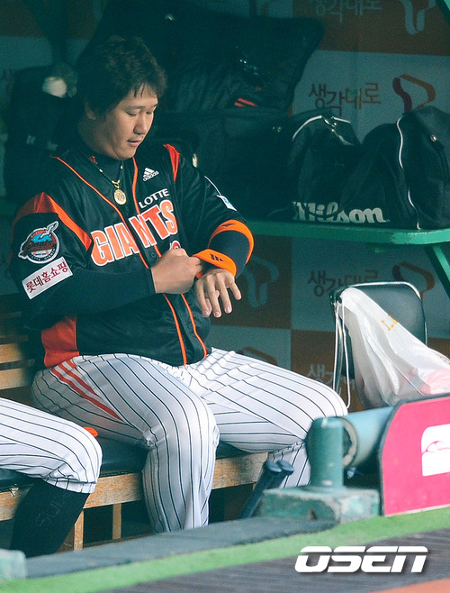 사직구장에서는 1승 1패로 호각을 이뤘다. 이제 문학구장에서 한국시리즈 진출 티켓을 위한 열전을 치른다. 19일 오후 인천 문학구장에서 열린 '2011 롯데카드 프로야구' 플레이오프 3차전 롯데 자이언츠와 SK 와이번스의 경기에 앞서 롯데 이대호가 더그아웃에서 손목 보호대를 하고 있다. 양팀은 1차전서는 연장 접전 끝에 정상호의 홈런을 앞세운 SK가, 2차전서는 송승준의 역투와 전준우의 투런 홈런으로 롯데가 승리를 거둬 사이좋게 1승씩을 나누어 가졌다. 3차전에서 SK는 송은범(27)을, 롯데는 라이언 사도스키(29)를 선발 마운드에 내세웠다. 두 투수 모두 올 시즌에는 상대 타선에 열세를 면치 못했다. 시리즈 향방을 가를 3차전, 최근 10년 간 플레이오프 3차전 승리 팀이 한국시리즈 티켓을 따낸 경우는 7차례였다. /jpnews@osen.co.kr