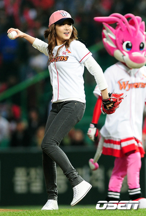 2011 롯데카드 프로야구 플레이오프 SK 와이번스와 롯데 자이언츠의 경기에 앞서 인기 탤런트 박민영이 멋진 폼으로 시구를 하고 있다. 19일 문학구장에서 벌어진 3차전서 SK는 송은범을 롯데는 사도스키를 내새워 한국시리즈로 가는 중요한 일전을 벌인다. 양팀은 1차전서는 연장 접전 끝에 정상호의 홈런을 앞세운 SK가 2차전서는 송승준의 역투와 전준우의 투런 홈런으로 롯데가 승리를 거두어 사이좋게 1승씩을 나누어 가졌다. SK 이만수 감독은 플레이오프 3차전을 앞두고 타순 조정을 통한 필승의지를 다졌다.이 감독은"박정권이 4번, 안치용이 5번, 그리고 최동수가 지명타자로 6번으로 배치 필승의 의지를 다졌다. 롯데 양승호 감독은 '선수들이 많이 성숙해졌다. 1차전서 그렇게 지고 위축될 줄 알았는데 2차전을 승리로 이끌었다'며 선수들을 칭찬 했다. /spjj@osen.co.kr