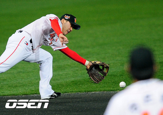 사직구장에서는 1승 1패로 호각을 이뤘다. 이제 문학구장에서 한국시리즈 진출 티켓을 위한 열전을 치른다. 19일 오후 인천 문학구장에서 열린 '2011 롯데카드 프로야구' 플레이오프 3차전 롯데 자이언츠와 SK 와이번스의 경기, 1회초 2사에서 SK 박진만이 롯데 전준우의 내야땅볼을 아쉽게 놓치고 있다. 양팀은 1차전서는 연장 접전 끝에 정상호의 홈런을 앞세운 SK가, 2차전서는 송승준의 역투와 전준우의 투런 홈런으로 롯데가 승리를 거둬 사이좋게 1승씩을 나누어 가졌다. 3차전에서 SK는 송은범(27)을, 롯데는 라이언 사도스키(29)를 선발 마운드에 내세웠다. 두 투수 모두 올 시즌에는 상대 타선에 열세를 면치 못했다. 시리즈 향방을 가를 3차전, 최근 10년 간 플레이오프 3차전 승리 팀이 한국시리즈 티켓을 따낸 경우는 7차례였다. /jpnews@osen.co.kr