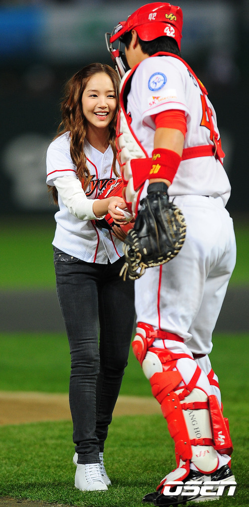 2011 롯데카드 프로야구 플레이오프 SK 와이번스와 롯데 자이언츠의 경기에 앞서 탤런트 박민영이 시구를 한후 SK 정상호 포수에게 공을 받고 있다. 19일 문학구장에서 벌어진 3차전서 SK는 송은범을 롯데는 사도스키를 내세워 한국시리즈로 가는 중요한 일전을 벌인다. 양팀은 1차전서는 연장 접전 끝에 정상호의 홈런을 앞세운 SK가 2차전서는 송승준의 역투와 전준우의 투런 홈런으로 롯데가 승리를 거두어 사이좋게 1승씩을 나누어 가졌다. SK 이만수 감독은 플레이오프 3차전을 앞두고 타순 조정을 통한 필승의지를 다졌다.이 감독은"박정권이 4번, 안치용이 5번, 그리고 최동수가 지명타자로 6번으로 배치 필승의 의지를 다졌다. 롯데 양승호 감독은 "선수들이 많이 성숙해졌다. 1차전서 그렇게 지고 위축될 줄 알았는데 2차전을 승리로 이끌었다"며 선수들을 칭찬 했다. / rumi@osen.co.kr