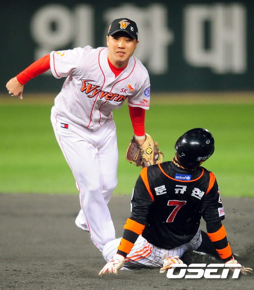 2011 롯데카드 프로야구 플레이오프 3차전 SK 와이번스와 롯데 자이언츠의 경기에서 4회초 1사 주자 1루 롯데 김주찬이 타석에서 삼진아웃을 당할때 1루 주자 문규현이 2루로 도루를 시도, SK 유격수 박진만에게 태그아웃을 당하고 있다. 19일 문학구장에서 벌어진 3차전서 SK는 송은범을 롯데는 사도스키를 내세워 한국시리즈로 가는 중요한 일전을 벌인다. 양팀은 1차전서는 연장 접전 끝에 정상호의 홈런을 앞세운 SK가 2차전서는 송승준의 역투와 전준우의 투런 홈런으로 롯데가 승리를 거두어 사이좋게 1승씩을 나누어 가졌다. SK 이만수 감독은 플레이오프 3차전을 앞두고 타순 조정을 통한 필승의지를 다졌다.이 감독은"박정권이 4번, 안치용이 5번, 그리고 최동수가 지명타자로 6번으로 배치 필승의 의지를 다졌다. 롯데 양승호 감독은 "선수들이 많이 성숙해졌다. 1차전서 그렇게 지고 위축될 줄 알았는데 2차전을 승리로 이끌었다"며 선수들을 칭찬했다. / rumi@osen.co.kr