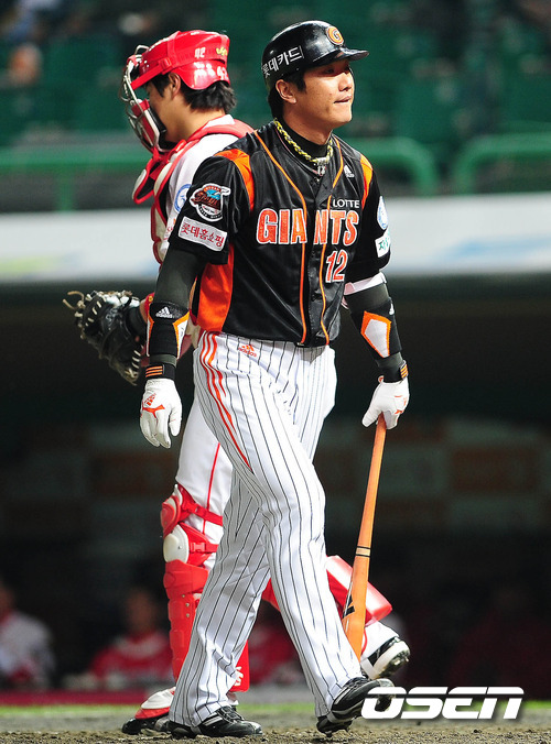 2011 롯데카드 프로야구 플레이오프 SK 와이번스와 롯데 자이언츠의 경기 4회초 1사 1루 김주찬이 삼진을 당하고 아쉬워 하고 있다. 19일 문학구장에서 벌어진 3차전서 SK는 송은범을 롯데는 사도스키를 내새워 한국시리즈로 가는 중요한 일전을 벌인다. 양팀은 1차전서는 연장 접전 끝에 정상호의 홈런을 앞세운 SK가 2차전서는 송승준의 역투와 전준우의 투런 홈런으로 롯데가 승리를 거두어 사이좋게 1승씩을 나누어 가졌다. SK 이만수 감독은 플레이오프 3차전을 앞두고 타순 조정을 통한 필승의지를 다졌다.이 감독은"박정권이 4번, 안치용이 5번, 그리고 최동수가 지명타자로 6번으로 배치 필승의 의지를 다졌다. 롯데 양승호 감독은 '선수들이 많이 성숙해졌다. 1차전서 그렇게 지고 위축될 줄 알았는데 2차전을 승리로 이끌었다'며 선수들을 칭찬 했다. /spjj@osen.co.kr