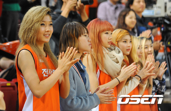 '2011~2012 KB국민카드 프로농구' 인천 전자랜드와 전주 KCC의 경기가 19일 인천 삼산월드체육관에서 열렸다. 경기 전 걸그룹 지피베이직이 관중석에서 경기를 바라보고 있다. 문태종과 함께 팀을 이끌던 국보급 센터 서장훈의 이적으로 전력상 공백이 생긴 전자랜드와 시즌 개막 후 2연승을 달리고 있는 KCC의 치열한 경기가 예상된다. / sunday@osen.co.kr