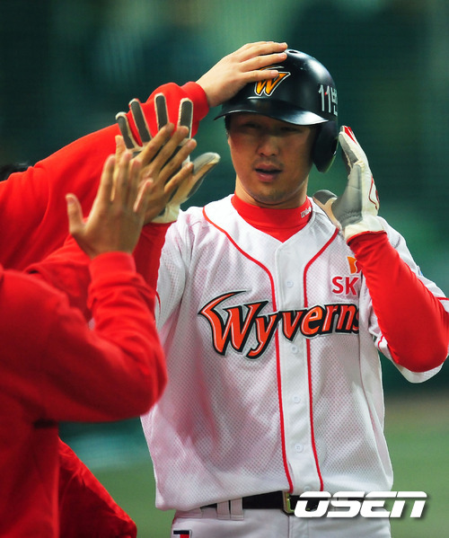 2011 롯데카드 프로야구 플레이오프 3차전 SK 와이번스와 롯데 자이언츠의 경기에서 4회초 1사 주자 1,3루 SK 최동수의 좌익수 왼쪽 선취 1타점 적시타때 홈을 밟은 최정이 덕아웃에서 동료들과 기쁨을 나누고 있다. 19일 문학구장에서 벌어진 3차전서 SK는 송은범을 롯데는 사도스키를 내세워 한국시리즈로 가는 중요한 일전을 벌인다. 양팀은 1차전서는 연장 접전 끝에 정상호의 홈런을 앞세운 SK가 2차전서는 송승준의 역투와 전준우의 투런 홈런으로 롯데가 승리를 거두어 사이좋게 1승씩을 나누어 가졌다. SK 이만수 감독은 플레이오프 3차전을 앞두고 타순 조정을 통한 필승의지를 다졌다.이 감독은"박정권이 4번, 안치용이 5번, 그리고 최동수가 지명타자로 6번으로 배치 필승의 의지를 다졌다. 롯데 양승호 감독은 "선수들이 많이 성숙해졌다. 1차전서 그렇게 지고 위축될 줄 알았는데 2차전을 승리로 이끌었다"며 선수들을 칭찬했다. / rumi@osen.co.kr