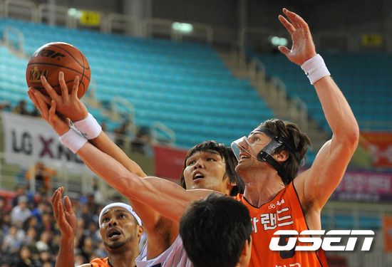 '2011~2012 KB국민카드 프로농구' 인천 전자랜드와 전주 KCC의 경기가 19일 인천 삼산월드체육관에서 열렸다. 2쿼터 KCC 하승진과 전자랜드 브로만이 리바운드 다툼을 하고 있다. 문태종과 함께 팀을 이끌던 국보급 센터 서장훈의 이적으로 전력상 공백이 생긴 전자랜드와 시즌 개막 후 2연승을 달리고 있는 KCC의 치열한 경기가 예상된다. / sunday@osen.co.kr