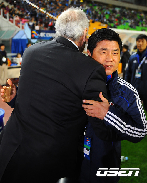 19일 오후 경기도 수원시 수원월드컵경기장서 열린 '2011 아시아축구연맹(AFC) 챔피언스리그' 4강전 1차전 수원 삼성과 알 사드(카타르)의 경기 전 수원 윤성효 감독과 알 사드 포사티 감독과 인사를 하고 있다 알 사드는 카타르 프로축구에서 11차례나 우승한 강호로 2006~2008년까지 수원에서 뛰었던 이정수가 알 사드에 소속되어 있어 국내팬들의 관심을 모으고 있는 팀이다. 수원은 오범석이 경고 누적으로 출전하지 못한다는 점은 아쉽지만 염기훈, 박현범 등 K리그에서 최상의 모습을 보이고 있는 선수들을 앞세워 알 사드의 기세를 꺾겠다는 각오다. /soul1014@osen.co.kr