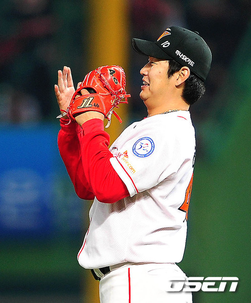 2011 롯데카드 프로야구 플레이오프 SK 와이번스와 롯데 자이언츠의 경기 6회초 1사 강민호의 잘맞은 타구를 박재상 좌익수가 처리하자 송은범이 박수를 보내고 있다. 19일 문학구장에서 벌어진 3차전서 SK는 송은범을 롯데는 사도스키를 내새워 한국시리즈로 가는 중요한 일전을 벌인다. 양팀은 1차전서는 연장 접전 끝에 정상호의 홈런을 앞세운 SK가 2차전서는 송승준의 역투와 전준우의 투런 홈런으로 롯데가 승리를 거두어 사이좋게 1승씩을 나누어 가졌다. SK 이만수 감독은 플레이오프 3차전을 앞두고 타순 조정을 통한 필승의지를 다졌다.이 감독은"박정권이 4번, 안치용이 5번, 그리고 최동수가 지명타자로 6번으로 배치 필승의 의지를 다졌다. 롯데 양승호 감독은 '선수들이 많이 성숙해졌다. 1차전서 그렇게 지고 위축될 줄 알았는데 2차전을 승리로 이끌었다'며 선수들을 칭찬 했다. /spjj@osen.co.kr