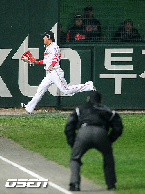 사직구장에서는 1승 1패로 호각을 이뤘다. 이제 문학구장에서 한국시리즈 진출 티켓을 위한 열전을 치른다. 19일 오후 인천 문학구장에서 열린 '2011 롯데카드 프로야구' 플레이오프 3차전 롯데 자이언츠와 SK 와이번스의 경기, 6회초 1사에서 SK 박재상이 롯데 강민호의 타구를 잡아내고 있다. 양팀은 1차전서는 연장 접전 끝에 정상호의 홈런을 앞세운 SK가, 2차전서는 송승준의 역투와 전준우의 투런 홈런으로 롯데가 승리를 거둬 사이좋게 1승씩을 나누어 가졌다. 3차전에서 SK는 송은범(27)을, 롯데는 라이언 사도스키(29)를 선발 마운드에 내세웠다. 두 투수 모두 올 시즌에는 상대 타선에 열세를 면치 못했다. 시리즈 향방을 가를 3차전, 최근 10년 간 플레이오프 3차전 승리 팀이 한국시리즈 티켓을 따낸 경우는 7차례였다. /jpnews@osen.co.kr