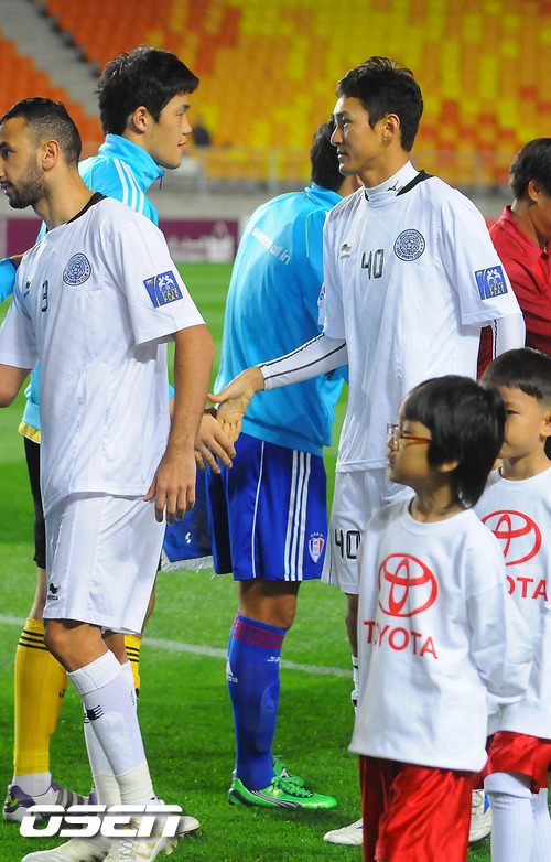 19일 오후 경기도 수원시 수원월드컵경기장서 열린 '2011 아시아축구연맹(AFC) 챔피언스리그' 4강전 1차전 수원 삼성과 알 사드(카타르)의 경기 알 사드 이정수와 수원 정성룡 골키퍼가 인사를 하고 있다. 알 사드는 카타르 프로축구에서 11차례나 우승한 강호로 2006~2008년까지 수원에서 뛰었던 이정수가 알 사드에 소속되어 있어 국내팬들의 관심을 모으고 있는 팀이다. 수원은 오범석이 경고 누적으로 출전하지 못한다는 점은 아쉽지만 염기훈, 박현범 등 K리그에서 최상의 모습을 보이고 있는 선수들을 앞세워 알 사드의 기세를 꺾겠다는 각오다. /soul1014@osen.co.kr