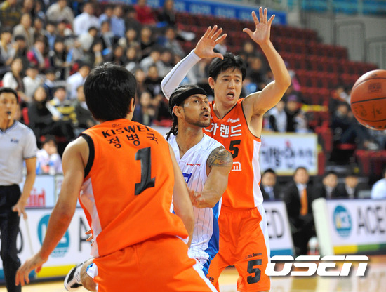 '2011~2012 KB국민카드 프로농구' 인천 전자랜드와 전주 KCC의 경기가 19일 인천 삼산월드체육관에서 열렸다. 2쿼터 KCC 전태풍이 전자랜드 수비진 틈으로 재치 있는 패스를 하고 있다. 문태종과 함께 팀을 이끌던 국보급 센터 서장훈의 이적으로 전력상 공백이 생긴 전자랜드와 시즌 개막 후 2연승을 달리고 있는 KCC의 치열한 경기가 예상된다. / sunday@osen.co.kr