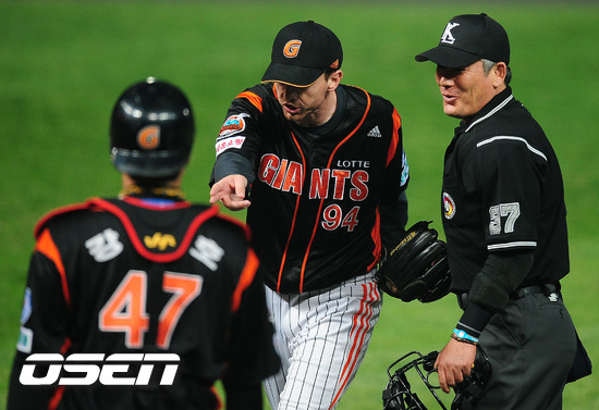 사직구장에서는 1승 1패로 호각을 이뤘다. 이제 문학구장에서 한국시리즈 진출 티켓을 위한 열전을 치른다. 19일 오후 인천 문학구장에서 열린 '2011 롯데카드 프로야구' 플레이오프 3차전 롯데 자이언츠와 SK 와이번스의 경기, 6회말 1사에서 롯데 사도스키가 SK 최정에 사구를 허용하고 김병주 주심에게 불만을 나타내고 있다. 양팀은 1차전서는 연장 접전 끝에 정상호의 홈런을 앞세운 SK가, 2차전서는 송승준의 역투와 전준우의 투런 홈런으로 롯데가 승리를 거둬 사이좋게 1승씩을 나누어 가졌다. 3차전에서 SK는 송은범(27)을, 롯데는 라이언 사도스키(29)를 선발 마운드에 내세웠다. 두 투수 모두 올 시즌에는 상대 타선에 열세를 면치 못했다. 시리즈 향방을 가를 3차전, 최근 10년 간 플레이오프 3차전 승리 팀이 한국시리즈 티켓을 따낸 경우는 7차례였다. /jpnews@osen.co.kr