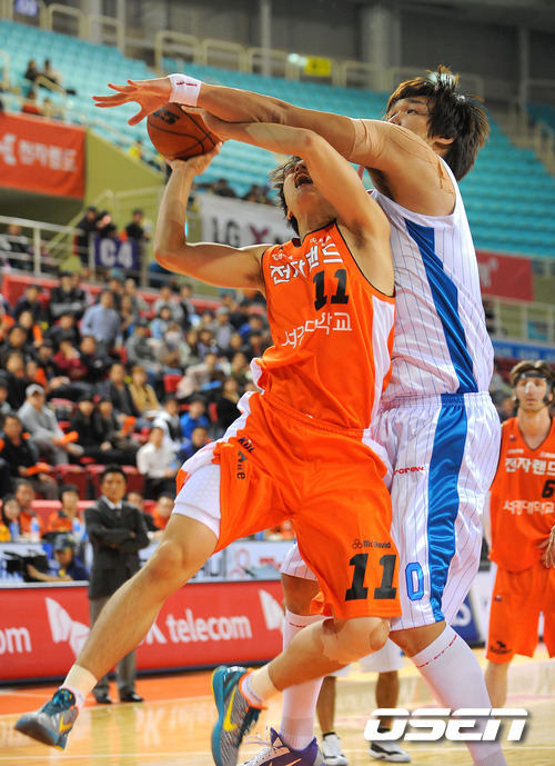 '2011~2012 KB국민카드 프로농구' 인천 전자랜드와 전주 KCC의 경기가 19일 인천 삼산월드체육관에서 열렸다. 3쿼터 전자랜드 함누리가 KCC 하승진에게 반칙을 당하고 있다. 문태종과 함께 팀을 이끌던 국보급 센터 서장훈의 이적으로 전력상 공백이 생긴 전자랜드와 시즌 개막 후 2연승을 달리고 있는 KCC의 치열한 경기가 예상된다. / sunday@osen.co.kr
