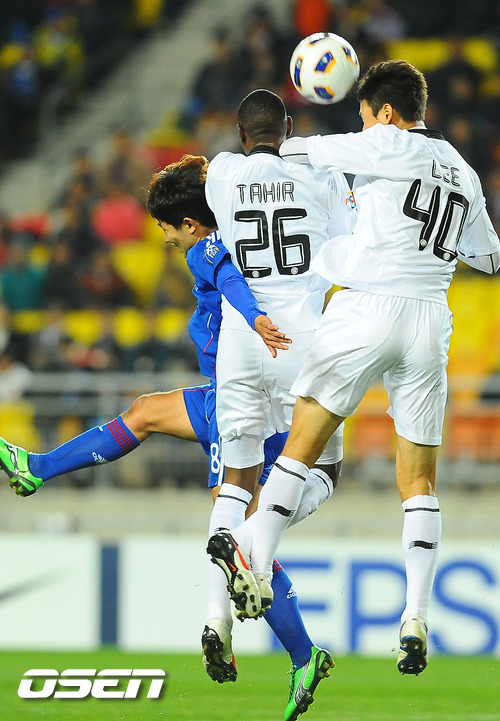 19일 오후 경기도 수원시 수원월드컵경기장서 열린 '2011 아시아축구연맹(AFC) 챔피언스리그' 4강전 1차전 수원 삼성과 알 사드(카타르)의 경기 전반 수원 이상호가 알 사드 이정수와 공중볼을 다투고 있다. 알 사드는 카타르 프로축구에서 11차례나 우승한 강호로 2006~2008년까지 수원에서 뛰었던 이정수가 알 사드에 소속되어 있어 국내팬들의 관심을 모으고 있는 팀이다. 수원은 오범석이 경고 누적으로 출전하지 못한다는 점은 아쉽지만 염기훈, 박현범 등 K리그에서 최상의 모습을 보이고 있는 선수들을 앞세워 알 사드의 기세를 꺾겠다는 각오다. /soul1014@osen.co.kr