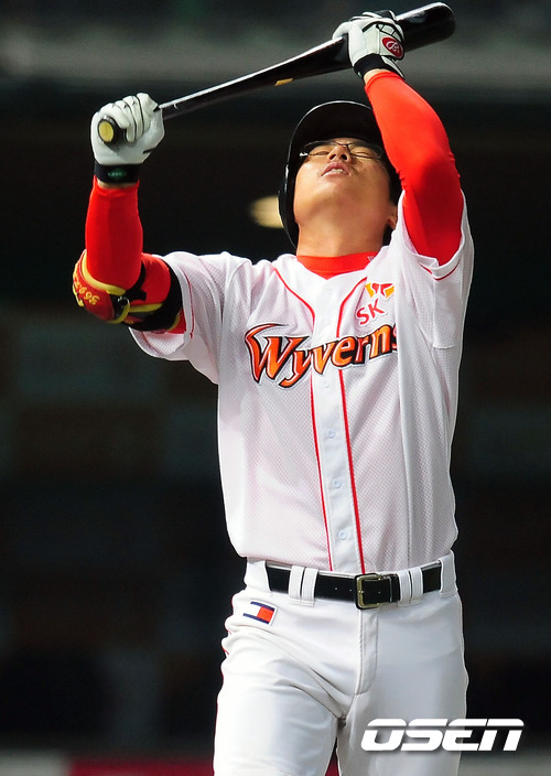 2011 롯데카드 프로야구 플레이오프 3차전 SK 와이번스와 롯데 자이언츠의 경기에서 6회말 1사 주자 2루 SK 박정권이 타석에서 삼진 아웃을 당한 후 아쉬워하고 있다. 19일 문학구장에서 벌어진 3차전서 SK는 송은범을 롯데는 사도스키를 내세워 한국시리즈로 가는 중요한 일전을 벌인다. 양팀은 1차전서는 연장 접전 끝에 정상호의 홈런을 앞세운 SK가 2차전서는 송승준의 역투와 전준우의 투런 홈런으로 롯데가 승리를 거두어 사이좋게 1승씩을 나누어 가졌다. SK 이만수 감독은 플레이오프 3차전을 앞두고 타순 조정을 통한 필승의지를 다졌다.이 감독은"박정권이 4번, 안치용이 5번, 그리고 최동수가 지명타자로 6번으로 배치 필승의 의지를 다졌다. 롯데 양승호 감독은 "선수들이 많이 성숙해졌다. 1차전서 그렇게 지고 위축될 줄 알았는데 2차전을 승리로 이끌었다"며 선수들을 칭찬했다. / rumi@osen.co.kr