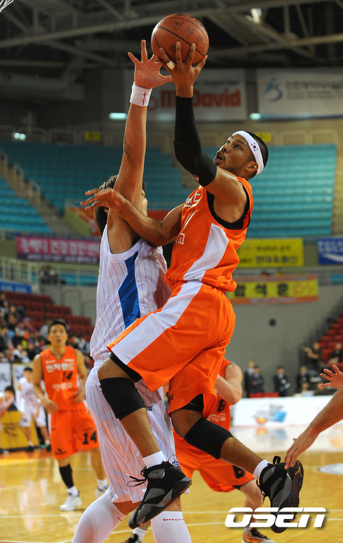 '2011~2012 KB국민카드 프로농구' 인천 전자랜드와 전주 KCC의 경기가 19일 인천 삼산월드체육관에서 열렸다. 3쿼터 전자랜드 문태종이 KCC 하승진의 수비를 피해 슛을 시도하고 있다. 문태종과 함께 팀을 이끌던 국보급 센터 서장훈의 이적으로 전력상 공백이 생긴 전자랜드와 시즌 개막 후 2연승을 달리고 있는 KCC의 치열한 경기가 예상된다. / sunday@osen.co.kr