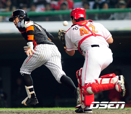 2011 롯데카드 프로야구 플레이오프 SK 와이번스와 롯데 자이언츠의 경기 7회초 무사 1루 문규현의 번트가 정상호 포수의 바로 앞에 떨어져 병살이 예상됐지만 정상호 포수가 더듬어 타자 주자만 아웃 시켰다. 19일 문학구장에서 벌어진 3차전서 SK는 송은범을 롯데는 사도스키를 내새워 한국시리즈로 가는 중요한 일전을 벌인다. 양팀은 1차전서는 연장 접전 끝에 정상호의 홈런을 앞세운 SK가 2차전서는 송승준의 역투와 전준우의 투런 홈런으로 롯데가 승리를 거두어 사이좋게 1승씩을 나누어 가졌다. SK 이만수 감독은 플레이오프 3차전을 앞두고 타순 조정을 통한 필승의지를 다졌다.이 감독은"박정권이 4번, 안치용이 5번, 그리고 최동수가 지명타자로 6번으로 배치 필승의 의지를 다졌다. 롯데 양승호 감독은 '선수들이 많이 성숙해졌다. 1차전서 그렇게 지고 위축될 줄 알았는데 2차전을 승리로 이끌었다'며 선수들을 칭찬 했다. /spjj@osen.co.kr