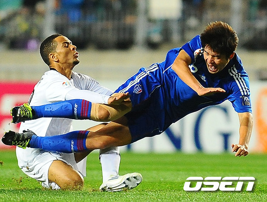 19일 오후 경기도 수원시 수원월드컵경기장서 열린 '2011 아시아축구연맹(AFC) 챔피언스리그' 4강전 1차전 수원 삼성과 알 사드(카타르)의 경기 전반 수원 박종진이 알 사드 수비수에게 걸려 넘어지고 있다. 알 사드는 카타르 프로축구에서 11차례나 우승한 강호로 2006~2008년까지 수원에서 뛰었던 이정수가 알 사드에 소속되어 있어 국내팬들의 관심을 모으고 있는 팀이다. 수원은 오범석이 경고 누적으로 출전하지 못한다는 점은 아쉽지만 염기훈, 박현범 등 K리그에서 최상의 모습을 보이고 있는 선수들을 앞세워 알 사드의 기세를 꺾겠다는 각오다. /soul1014@osen.co.kr