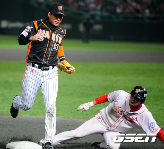 사직구장에서는 1승 1패로 호각을 이뤘다. 이제 문학구장에서 한국시리즈 진출 티켓을 위한 열전을 치른다. 19일 오후 인천 문학구장에서 열린 '2011 롯데카드 프로야구' 플레이오프 3차전 롯데 자이언츠와 SK 와이번스의 경기, 7회말 1사 1,3루에서 롯데 황재균이 SK 정근우의 타구를 잡아 3루주자 김강민을 아웃시키며 위기를 벗어나고 있다. 양팀은 1차전서는 연장 접전 끝에 정상호의 홈런을 앞세운 SK가, 2차전서는 송승준의 역투와 전준우의 투런 홈런으로 롯데가 승리를 거둬 사이좋게 1승씩을 나누어 가졌다. 3차전에서 SK는 송은범(27)을, 롯데는 라이언 사도스키(29)를 선발 마운드에 내세웠다. 두 투수 모두 올 시즌에는 상대 타선에 열세를 면치 못했다. 시리즈 향방을 가를 3차전, 최근 10년 간 플레이오프 3차전 승리 팀이 한국시리즈 티켓을 따낸 경우는 7차례였다. /jpnews@osen.co.kr