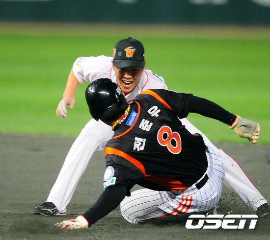 2011 롯데카드 프로야구 플레이오프 3차전 SK 와이번스와 롯데 자이언츠의 경기에서 8회초 1사 주자 1루 롯데 홍성흔이 타석에서 삼진아웃을 당할때 1루 주자 전준우가 2루 도루를 시도, SK 정근우에게 태그아웃을 당하고 있다. 19일 문학구장에서 벌어진 3차전서 SK는 송은범을 롯데는 사도스키를 내세워 한국시리즈로 가는 중요한 일전을 벌인다. 양팀은 1차전서는 연장 접전 끝에 정상호의 홈런을 앞세운 SK가 2차전서는 송승준의 역투와 전준우의 투런 홈런으로 롯데가 승리를 거두어 사이좋게 1승씩을 나누어 가졌다. SK 이만수 감독은 플레이오프 3차전을 앞두고 타순 조정을 통한 필승의지를 다졌다.이 감독은"박정권이 4번, 안치용이 5번, 그리고 최동수가 지명타자로 6번으로 배치 필승의 의지를 다졌다. 롯데 양승호 감독은 "선수들이 많이 성숙해졌다. 1차전서 그렇게 지고 위축될 줄 알았는데 2차전을 승리로 이끌었다"며 선수들을 칭찬했다. / rumi@osen.co.kr