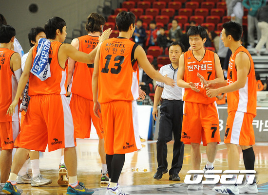 유도훈 감독이 지휘하는 인천 전자랜드는 19일 저녁 인천 삼산실내체육관서 열린 전주 KCC와 '2011-2012 KB국민카드' 1라운드 홈 경기서 79-76으로 승리를 거뒀다. 이로써 전자랜드는 강력한 우승 후보로 꼽히는 세 팀(부산 KT-승, 원주 동부-패, 전주 KCC-승)에 2승 1패를 기록하게 됐다. 경기 후 전자랜드 선수들이 승리의 기쁨을 나누고 있다. 경기 전 유도훈 전자랜드 감독은 "초반 3경기(KT, 동부, KCC)에서의 최상의 목표는 2승 1패다"며 전주 KCC에 승리했으면 하는 속내를 펼쳤다. 이러한 유도훈 감독의 속내가 선수들에게 제대로 전달이 됐는지 전자랜드 선수들의 발걸음은 한결 가벼웠다. 1쿼터에 리드를 잡았던 전자랜드는 2쿼터에 잠시 역전을 허용했지만 3쿼터부터 자신들의 공격을 마음껏 펼치며 결국 승리를 차지했다. / sunday@osen.co.kr