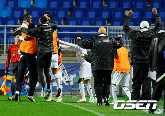 19일 오후 경기도 수원시 수원월드컵경기장서 열린 '2011 아시아축구연맹(AFC) 챔피언스리그' 4강전 1차전 수원 삼성과 알 사드(카타르)의 경기 후반 알 사드 니앙이 선취골을 넣고 환호하고 있다. 알 사드는 카타르 프로축구에서 11차례나 우승한 강호로 2006~2008년까지 수원에서 뛰었던 이정수가 알 사드에 소속되어 있어 국내팬들의 관심을 모으고 있는 팀이다. 수원은 오범석이 경고 누적으로 출전하지 못한다는 점은 아쉽지만 염기훈, 박현범 등 K리그에서 최상의 모습을 보이고 있는 선수들을 앞세워 알 사드의 기세를 꺾겠다는 각오다. /soul1014@osen.co.kr