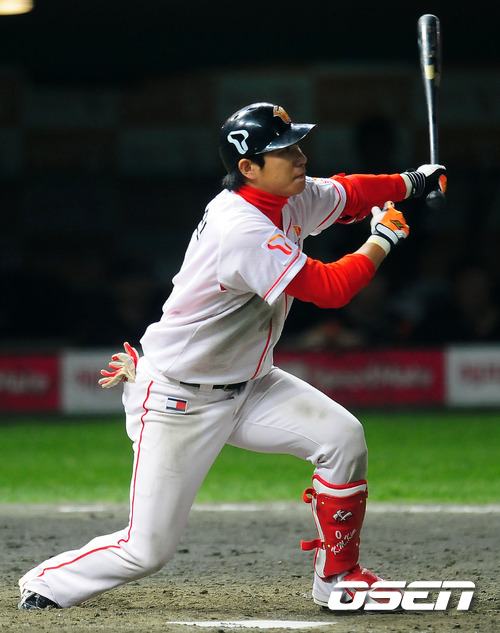 2011 롯데카드 프로야구 플레이오프 3차전 SK 와이번스와 롯데 자이언츠의 경기에서 8회말 2사 주자 만루 SK 김강민이 좌중간 2타점 적시타를 날리고 있다. 19일 문학구장에서 벌어진 3차전서 SK는 송은범을 롯데는 사도스키를 내세워 한국시리즈로 가는 중요한 일전을 벌인다. 양팀은 1차전서는 연장 접전 끝에 정상호의 홈런을 앞세운 SK가 2차전서는 송승준의 역투와 전준우의 투런 홈런으로 롯데가 승리를 거두어 사이좋게 1승씩을 나누어 가졌다. SK 이만수 감독은 플레이오프 3차전을 앞두고 타순 조정을 통한 필승의지를 다졌다.이 감독은"박정권이 4번, 안치용이 5번, 그리고 최동수가 지명타자로 6번으로 배치 필승의 의지를 다졌다. 롯데 양승호 감독은 "선수들이 많이 성숙해졌다. 1차전서 그렇게 지고 위축될 줄 알았는데 2차전을 승리로 이끌었다"며 선수들을 칭찬했다. / rumi@osen.co.kr