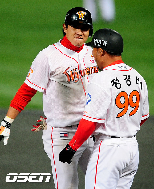 사직구장에서는 1승 1패로 호각을 이뤘다. 이제 문학구장에서 한국시리즈 진출 티켓을 위한 열전을 치른다. 19일 오후 인천 문학구장에서 열린 '2011 롯데카드 프로야구' 플레이오프 3차전 롯데 자이언츠와 SK 와이번스의 경기, 8회말 2사 만루에서 SK 김강민이 2타점 적시타를 날리고 기뻐하고 있다. 양팀은 1차전서는 연장 접전 끝에 정상호의 홈런을 앞세운 SK가, 2차전서는 송승준의 역투와 전준우의 투런 홈런으로 롯데가 승리를 거둬 사이좋게 1승씩을 나누어 가졌다. 3차전에서 SK는 송은범(27)을, 롯데는 라이언 사도스키(29)를 선발 마운드에 내세웠다. 두 투수 모두 올 시즌에는 상대 타선에 열세를 면치 못했다. 시리즈 향방을 가를 3차전, 최근 10년 간 플레이오프 3차전 승리 팀이 한국시리즈 티켓을 따낸 경우는 7차례였다. /jpnews@osen.co.kr