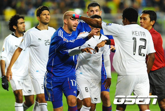 19일 오후 경기도 수원시 수원월드컵경기장서 열린 '2011 아시아축구연맹(AFC) 챔피언스리그' 4강전 1차전 수원 삼성과 알 사드(카타르)의 경기 후반 알 사드의 추가골때 관중이 그라운드에 난입했다. 이에 알 사드 케이타가 관중에게 폭행했다. 수원 게인리히와 스테보가 케이타에게 항의하고 있다. 알 사드는 카타르 프로축구에서 11차례나 우승한 강호로 2006~2008년까지 수원에서 뛰었던 이정수가 알 사드에 소속되어 있어 국내팬들의 관심을 모으고 있는 팀이다. 수원은 오범석이 경고 누적으로 출전하지 못한다는 점은 아쉽지만 염기훈, 박현범 등 K리그에서 최상의 모습을 보이고 있는 선수들을 앞세워 알 사드의 기세를 꺾겠다는 각오다. /soul1014@osen.co.kr