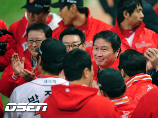 이제 1승 남았다. SK 와이번스가 5년 연속 한국시리즈 진출을 눈앞에 뒀다. SK는 19일 문학구장에서 열린 롯데와의 플레이오프 3차전에서 우완 선발 송은범의 무실점 호투와 팀내 최고령 최동수의 결승타, 김강민의 2타점 쐐기타를 앞세워 3-0으로 짜릿한 1점차 승리를 안았다. 경기후 SK 최태원 회장이 코칭스태프를 비롯한 선수들을 격려하고 있다. /jpnews@osen.co.kr