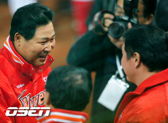 이제 1승 남았다. SK 와이번스가 5년 연속 한국시리즈 진출을 눈앞에 뒀다. SK는 19일 문학구장에서 열린 롯데와의 플레이오프 3차전에서 우완 선발 송은범의 무실점 호투와 팀내 최고령 최동수의 결승타, 김강민의 2타점 쐐기타를 앞세워 3-0으로 짜릿한 1점차 승리를 안았다. 경기후 SK 이만수 감독대행이 최태원 회장과 인사를 나누고 있다./jpnews@osen.co.kr