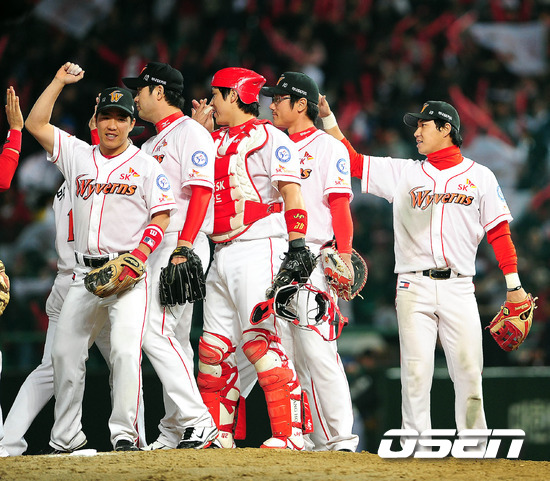 이제 1승 남았다. SK 와이번스가 5년 연속 한국시리즈 진출을 눈앞에 뒀다. SK는 19일 문학구장에서 열린 롯데와의 플레이오프 3차전에서 우완 선발 송은범의 무실점 호투와 팀내 최고령 최동수의 결승타, 김강민의 2타점 쐐기타를 앞세워 3-0으로 짜릿한 완봉 승리를 거두었다 . 송은범은 이날 6이닝 3피안타 3볼넷 4탈삼진 무실점으로 혼신의 역투를 선보였다. 감기와 팔꿈치 통증으로 완전한 몸상태가 아닌데도 불구, 최고의 피칭으로 롯데 타선을 막아냈다. 총투구수는 98개. 직구는 최고 155km를 전광판에 찍는 최고의 피칭을 했다. 승리를 거둔 SK 선수들이 마운드에 모여 승리의 기쁨을 나누고 있다. /spjj@osen.co.kr