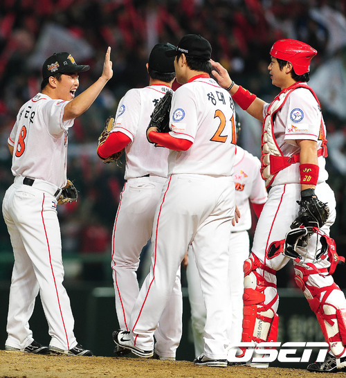 이제 1승 남았다. SK 와이번스가 5년 연속 한국시리즈 진출을 눈앞에 뒀다. SK는 19일 문학구장에서 열린 롯데와의 플레이오프 3차전에서 우완 선발 송은범의 무실점 호투와 팀내 최고령 최동수의 결승타, 김강민의 2타점 쐐기타를 앞세워 3-0으로 짜릿한 완봉 승리를 거두었다 . 송은범은 이날 6이닝 3피안타 3볼넷 4탈삼진 무실점으로 혼신의 역투를 선보였다. 감기와 팔꿈치 통증으로 완전한 몸상태가 아닌데도 불구, 최고의 피칭으로 롯데 타선을 막아냈다. 총투구수는 98개. 직구는 최고 155km를 전광판에 찍는 최고의 피칭을 했다. 승리를 거둔 SK 선수들이 마운드에 모여 승리의 기쁨을 나누고 있다. /spjj@osen.co.kr