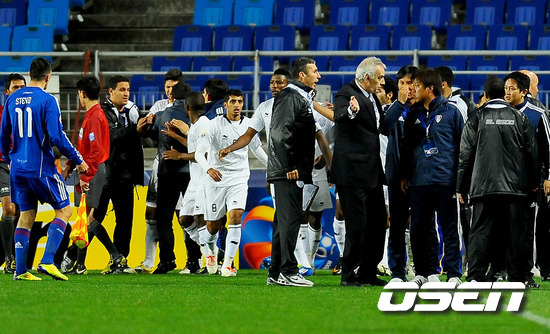 19일 오후 경기도 수원시 수원월드컵경기장서 열린 '2011 아시아축구연맹(AFC) 챔피언스리그' 4강전 1차전 수원 삼성과 알 사드(카타르)의 경기 후반 알사드의 추가골에 수원 고종수 코치가 항의하자 알사드 포사티 감독이 제지하고 있다. 알 사드는 카타르 프로축구에서 11차례나 우승한 강호로 2006~2008년까지 수원에서 뛰었던 이정수가 알 사드에 소속되어 있어 국내팬들의 관심을 모으고 있는 팀이다. 수원은 오범석이 경고 누적으로 출전하지 못한다는 점은 아쉽지만 염기훈, 박현범 등 K리그에서 최상의 모습을 보이고 있는 선수들을 앞세워 알 사드의 기세를 꺾겠다는 각오다. /soul1014@osen.co.kr