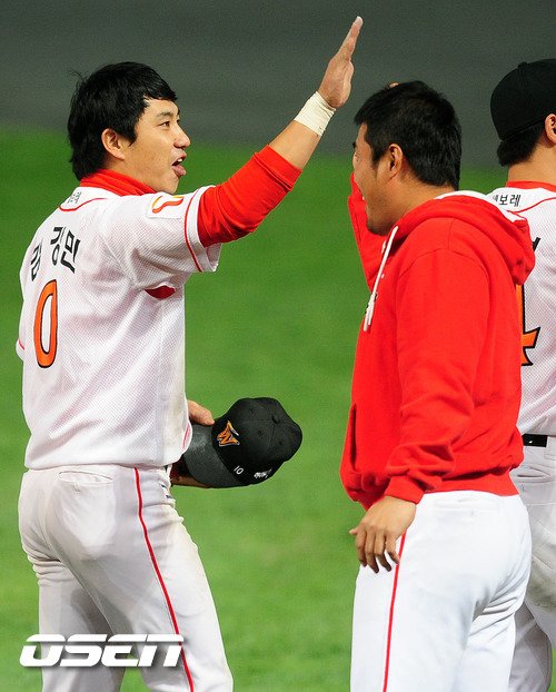 이제 1승 남았다. SK 와이번스가 5년 연속 한국시리즈 진출을 눈앞에 뒀다. SK는 19일 문학구장에서 열린 롯데와의 플레이오프 3차전에서 우완 선발 송은범의 무실점 호투와 팀내 최고령 최동수의 결승타, 김강민의 2타점 쐐기타를 앞세워 3-0으로 짜릿한 1점차 승리를 안았다. 경기후 SK 김강민과 최동수가 하이파이브를 하고 있다. /jpnews@osen.co.kr