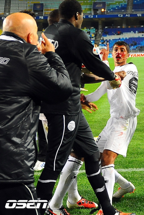 수원이 19일 오후 수원월드컵경기장에서 열린 알 사드(카타르)와 2011 아시아축구연맹(AFC) 챔피언스리그 4강 1차전에서 0-2로 패했다. 이로써 수원은 오는 27일 자정 알 사드의 홈구장인 알 사드 스타디움에서 열릴 8강 2차전을 앞두고 큰 부담을 안게 됐다. 후반 과열된 양팀 선수들의 몸싸움중 알사드 메사드가 피를 흘리고 있다. /soul1014@osen.co.kr
