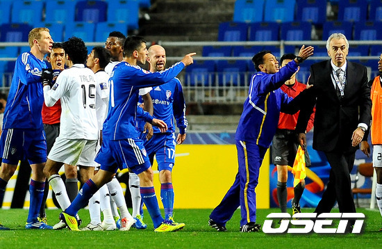 수원이 19일 오후 수원월드컵경기장에서 열린 알 사드(카타르)와 2011 아시아축구연맹(AFC) 챔피언스리그 4강 1차전에서 0-2로 패했다. 이로써 수원은 오는 27일 자정 알 사드의 홈구장인 알 사드 스타디움에서 열릴 8강 2차전을 앞두고 큰 부담을 안게 됐다. 후반 알사드의 매너없는 추가골에 수원 선수들이 알사드 포사티 감독에게 항의하고 있다. /soul1014@osen.co.kr