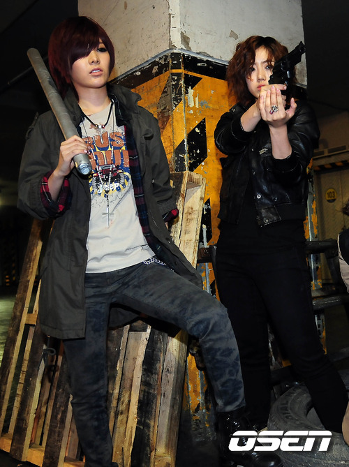 [OSEN=부산 ,백승철 인턴기자] 19일 오후 부산 서구 암남동에 위치한 한 물류창고에서 진행된 티아라 신작 뮤직비디오 제작현장에서 큐리, 은정이 사진촬영을 위해 포즈를 취하고 있다. 차은택 감독이 연출을 맡은 이번 뮤직비디오는 30분짜리 드라마 타이즈 형식으로 영화 같은 스토리 전개와 영상미를 맛 볼수 있다는게 특징이다. 10억원의 제작비가 투입되고 차승원과 지창욱이 출연해 더욱 관심을 끌고 있는 이번 티아라의 신작 뮤직비디오 오는 11월 말 공개될 예정이다. / baik@osen.co.kr