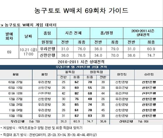 [농구토토] 국민체육진흥공단(www.kspo.or.kr)이 발행하는 체육진흥투표권 수탁사업자인 스포츠토토의 공식 온라인 발매 사이트 베트맨(www.betman.co.kr)이 21일 오후 5시 춘천호반체육관에서 벌어지는 2011-2012 여자프로농구(WKBL) 우리은행-신한은행전을 대상으로 농구토토 W매치 69회차를 발매한다. 이번 게임의 투표율을 중간 집계한 결과, 전체 참가자의 50.81%는 디펜딩 챔피언 신한은행이 우리은행을 상대로 승리를 거둘 것으로 예상했다. 10점 이내 박빙 승부를 펼칠 것으로 예상한 참가자는 25.06%로 집계됐고, 나머지 24.14%는 홈팀 우리은행의 승리를 예상했다. 전반전에서도 신한은행 우세(49.97%)가 1순위로 집계됐고, 우리은행 우세(32.23%)예상과 5점 이내 박빙(17.84%)예상이 뒤를 이었다. 전반득점대에서는 25-35점대 원정팀 신한은행 우세(10.47%)예상이 최다로 집계됐고, 최종득점대에서도 50-70점대 원정팀 신한은행 승리(13.92%) 예상이 가장 높게 나타났다. 스포츠토토 관계자는 "5년 연속 통합우승에 빛나는 신한은행이 3년 연속 리그 최하위를 기록한 우리은행을 상대로 승리를 거둘 것으로 예상됐다"며 "우리은행은 17일 지난 해 2월 이후 7연패를 당했던 신세계를 격파하는 등 올 시즌 좋은 출발을 보이고 있지만, 아직 신한은행의 적수로는 객관적 전력상 열세다"고 전했다. 농구토토 W매치 69회차는 경기시작 10분전인 21일 오후 4시 50분 발매가 마감된다.