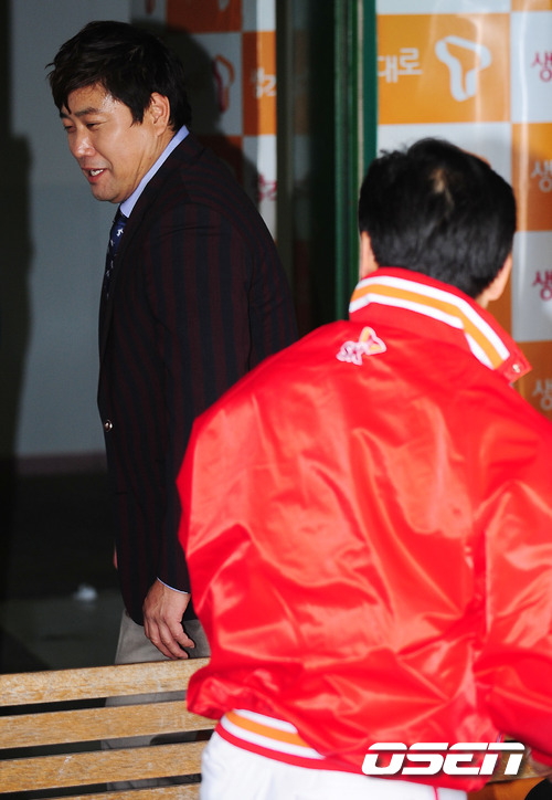 20일 오후 문학구장에서 '2011 롯데카드 프로야구 플레이오프' 4차전 SK 와이번스와 롯데 자이언츠의 경기가 열릴 예정인 가운데 양팀이 훈련시간을 가졌다. 덕아웃에서 양준혁 해설자가 SK 이만수 감독 대행에게 농담을 한 후 자리를 피하고 있다. 이번 4차전 선발로 SK는 윤희상(26)를 롯데는 크리스 부첵(33)을 내세운다. 플레이오프가 마감될 수 있는 4차전이라는 점에서 양 팀 모두 피할 수 없는 한판이다. 양팀은 1차전서는 연장 접전 끝에 정상호의 홈런을 앞세운 SK가 2차전서는 송승준의 역투와 전준우의 투런 홈런으로 롯데가 승리를 거두어 사이좋게 1승씩을 나누어 가졌다. 그러나 SK는 3차전서 선발 송은범의 무실점 호투와 최동수의 결승타, 김강민의 2타점 쐐기타를 앞세워 승리를 거둬 한국시리즈에 1승만을 남겨둔 상태. 반면 탈락 위기에 놓인 롯데는 필승의지를 다지고 있다. / rumi@osen.co.kr