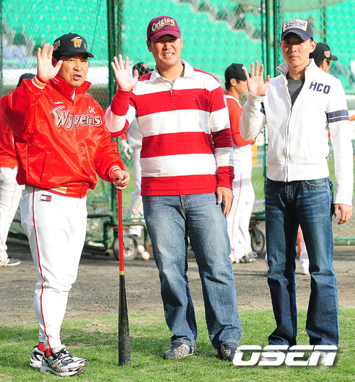 20일 오후 문학구장에서 '2011 롯데카드 프로야구 플레이오프' 4차전 SK 와이번스와 롯데 자이언츠의 경기가 열릴 예정인 가운데 양팀이 훈련시간을 가졌다. SK 이만수 감독 대행이 군복무 중 경기장을 찾은 SK 소속 이재원 윤석주에게 인사를 시키고 있다. 이번 4차전 선발로 SK는 윤희상(26)를 롯데는 크리스 부첵(33)을 내세운다. 플레이오프가 마감될 수 있는 4차전이라는 점에서 양 팀 모두 피할 수 없는 한판이다. 양팀은 1차전서는 연장 접전 끝에 정상호의 홈런을 앞세운 SK가 2차전서는 송승준의 역투와 전준우의 투런 홈런으로 롯데가 승리를 거두어 사이좋게 1승씩을 나누어 가졌다. 그러나 SK는 3차전서 선발 송은범의 무실점 호투와 최동수의 결승타, 김강민의 2타점 쐐기타를 앞세워 승리를 거둬 한국시리즈에 1승만을 남겨둔 상태. 반면 탈락 위기에 놓인 롯데는 필승의지를 다지고 있다. / rumi@osen.co.kr